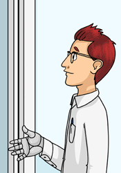 Clinton is a rather "bookish" person with a robotic prosthesis on his right arm, installed after his hand was destroyed in a fireworks accident.[1] He states that "...most people put a cover on theirs, but I think they look so much COOLER this way."[7] However, it means that it is unusable in water.[31] He is quite pleased to have it.[1] The hand's features include a semi-autonomous mode of operation in which it can carry out tasks while detached.[32] After his prosthetic hand was accidentally damaged by Elliot, Clinton agreed to start wearing a cover on the hand to prevent further issues.[33]