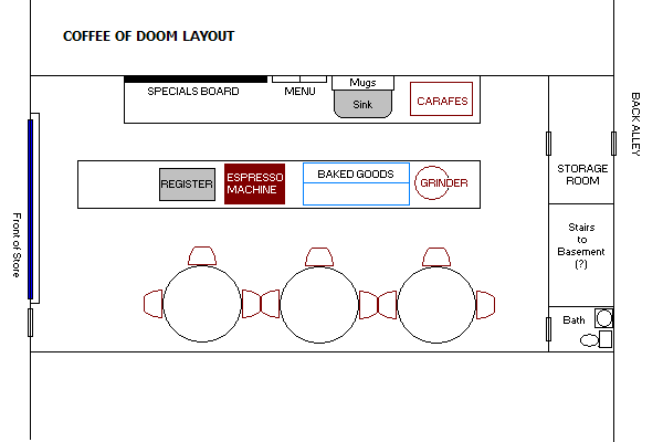 There is a basement, where Dora roasts beans[43] weekly[3] in a secret process[44] of which she is quite proud.[45] Dora has considered remodeling it as a cafe.[46] Although the basement has an infestation of spiders it is free of rats, at least to Dora's knowledge.[47] Hannelore put a large arm chair in the back of the store meant for Bubbles because of her mass and weight.