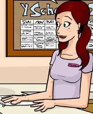 The gym receptionist is first seen in Number 997: Maple Syrup Run wearing a purple shirt. She is seen again in Number 1050: Battle Becomes A War wearing a white shirt.