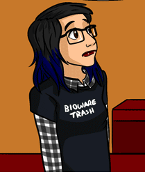 Her design is based on BioWare writer and author Sam Maggs.[4] Bleminda once came to Coffee of Doom with her friend Garbaldo. |